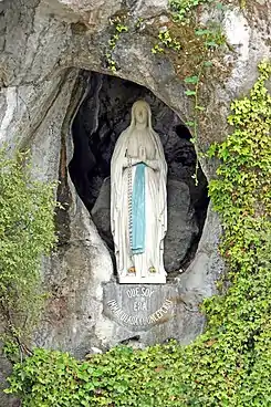 Se autorizó la veneración en 1862. (La talla de la Virgen colocada en la gruta fue esculpida por el escultor Joseph Hughes Fabisch (1812-1886), profesor de la Academia de las Ciencias, las Artes y las Letras de Lyon, entre fines de 1863 y comienzos de 1864) | |