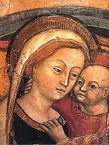 Simbología | Virgen con el niño en los brazos y manto azul cayendo sobre el niño. | |
