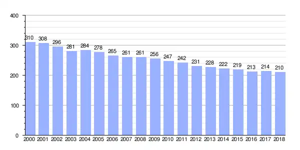 Gráfica de evolución demográfica de Oines entre 2000 y 2018