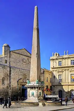 El obelisco es de granito rojo de Asia Menor. No posee ninguna inscripción. Su altura junto con su pedestal es de aproximadamente 20 m. El obelisco fue erigido por primera vez bajo el emperador romano Constantino II en el centro de la spina del circo romano de Arlés. Después de que el circo fue abandonado en el siglo sexto, el obelisco se cayó y se rompió en dos partes. Fue redescubierto en el siglo XIV y reconstruido en 1676.