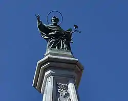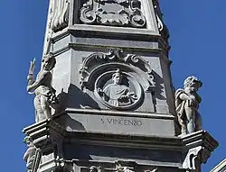 La escultura de bronce de Santo Domingo, ubicada en el punto más alto del obelisco, es de atribución incierta, ya que fue colocada sólo en 1747, dos años después de la muerte de Vaccaro, el cual, sin embargo, había dibujado el boceto de la estatua.[2][4]