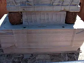 La cara este del pedestal tiene una inscripción en latín. Hoy es prácticamente ilegible, pero se transcribió íntegra por viajeros del siglo XVI. Dice: