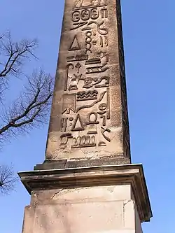 La entrada Obelisco se utilizó en la época de Federico únicamente como una salida del parque. El nombre del palacio está escrito unos pasos más allá del obelisco.