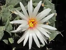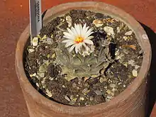 Es un cactus de hasta 12 cm de diámetro, aspecto globular y gran raíz axonomorfa. Cuerpo compuesto por grandes tubérculos de forma triangular de 5 a 15 mm de largo, de aspecto similar al de hojas y superpuestos en espiral. No tiene costillas. En las plantas adultas, la base del tubérculo mide entre 2 y 2,5 cm; la cara externa es curva y terminada en un borde agudo, mientras que la interna es plana. Sobre el ápice del tubérculo existe una pequeña areola con 2 a 4 espinas cortas y débiles, proyectadas hacia el exterior, de 5 a 15 mm de largo. Las flores miden unos 3 cm de diámetro, son de color blanco o rosado y nacen de las areolas de los tubérculos más jóvenes, en el centro de la planta. Fruto marrón claro, seco, (indehiscente), de 1,6 a 2,5 cm de largo. Semillas en forma de pera, tuberculadas, negras, de 1 mm de diámetro.