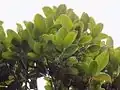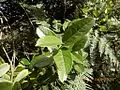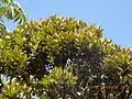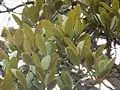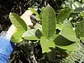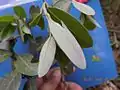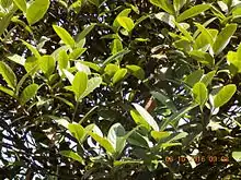 Posee hojas simples, alternas, sin estípulas, sin exudado, glabras, discoloras cuando son adultas, es decir, verde en el haz y de color blanquecino o ferruginoso en el envés. Posee una nervadura central de color amarillento marcada especialmente en el envés, con ápice levemente acuminado. Posee olor típico de la familia. La madera es color amarilla en tono suave. El fruto es típico de la familia, en este caso.