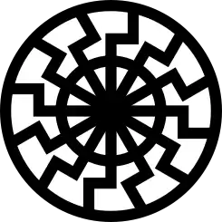![]() El sol negro (Schwarze Sonne), diseño empleado en el mosaico del Castillo de Wewelsburg. Es un símbolo que representa a un sol negro de doce rayos, el cual se creía que era la fuente de poder de los arios, de uso común entre los círculos del ocultismo nazi. | ||