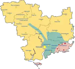 ![]() En rosa la parte de Nicolaiev al sureste ocupada por la Federación de Rusia, el resto en amarillo es la zona amarillo bajo el control del gobierno de Ucrania, la parte verde petróleo era territorio controlado por Rusia que fue desocupado. | ||