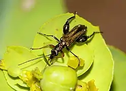- Macho de Oedemera nobilis siempre de un verde mucho más brillante que Oedemera flavipes y con la que se puede confundir