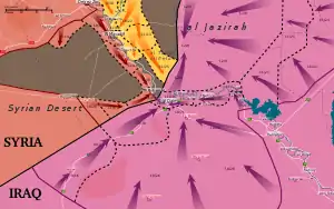 ![]() En rojo las fuerzas del gobierno sirio lograron hacer retroceder a las huestes del Estado Islámico paralelamente con los combates en Irak (morado) y el avance kurdo (amarillo) el grupo terrorista prácticamente queda acorralado. | ||||