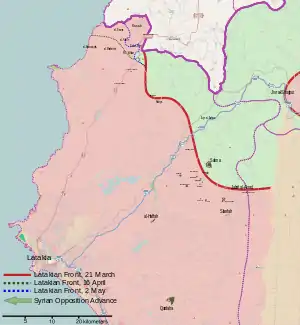 El 30 de marzo, según el OSDH, varios intentos por parte del Ejército de retomar zonas en el norte de Latakia fueron repelidos por los rebeldes. Sin embargo, el Ejército estaba llevando a más refuerzos de la ciudad de Tartus para tratar de frenar el avance de los rebeldes.[109]