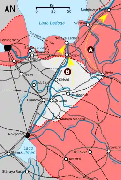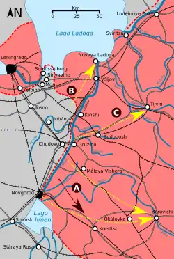 El contraataque contra el avance alemán hacia Tijvin fue simultáneo con el lanzado desde el río Neva en dirección a Siniávino, al este de Leningrado, con el objetivo de unir Leningrado de nuevo con las líneas soviéticas. El plan para el corredor de Siniávino involucró al Grupo Operacional Neva y al 55.º Ejército, que asaltaron por el Neva mientras que el 54.º Ejército de Jozin golpeba a los alemanes en su flanco oriental, quedando el XXVIII en medio de la tenaza. Los escasos resultados y la difícil situación en Tijvin obligaron a la Stavka a reorientar el esfuerzo del 54.º Ejército hacia el este, terminando con las esperanzas de levantar el cerco antes del 42. El enfrentamiento supuso que los alemanes relocalizaran cinco divisiones para defender el sector de Siniávino. Los combates en la zona serían continuados al año siguiente en lo que sería la Ofensiva de Siniávino.[28]