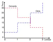 Según la ley de la oferta y la demanda, y asumiendo esa competencia perfecta, el precio de un bien se sitúa en la intersección de las curvas de oferta y demanda.[14] Si el precio de un bien está demasiado bajo y los consumidores demandan más de lo que los productores pueden poner en el mercado, se produce una situación de escasez, y por tanto los consumidores estarán dispuestos a pagar más. Los productores subirán los precios hasta que se alcance el nivel al cual los consumidores no estén dispuestos a comprar más si sigue subiendo el precio. En la situación inversa, si el precio de un bien es demasiado alto y los consumidores no están dispuestos a pagarlo, la tendencia será a que baje el precio, hasta que se llegue al nivel al cual los consumidores acepten el precio y se pueda vender todo lo que se produce.[15]