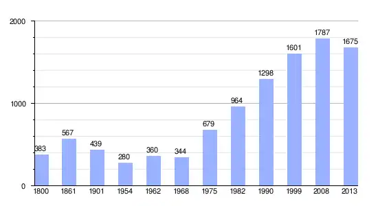 Gráfica de evolución demográfica de Ogy-Montoy-Flanville entre 1800 y 2013 |