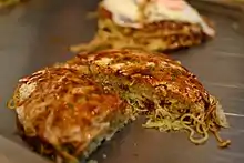 El okonomiyaki (お好み焼き?) es una comida japonesa que consiste en una masa con varios ingredientes cocinados a la plancha. La palabra okonomiyaki está formada por el honorífico o (お?), konomi (好み gusto?) y yaki (焼き cocinado a la plancha?), significando "cocinado (a la plancha) a su gusto" (en referencia al cliente, o puede ser también (alimento) huevo y repollo en juliana, junto con otros ingredientes dependiendo del tipo de referencia al cocinero).