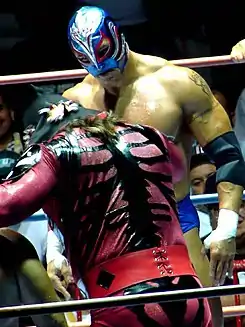 ![]() Olímpico (antes de perder su máscara) durante su lucha contra Super Parka. | ||