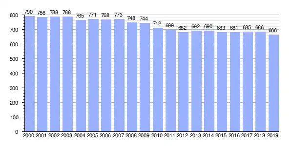 Gráfica de evolución demográfica de Oleiros (parroquia) entre 2000 y 2019 |