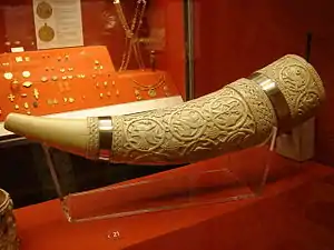 Los olifantes son instrumentos de viento tallados en un colmillo de elefante que utilizaban los caballeros durante la Edad Media haciéndolos sonar como señal de aviso. A menudo se denomina erróneamente "cuerno" a este instrumento. [1]