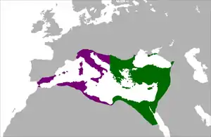 Mapa del Imperio bizantino en su máxima extensión, (siglo VI, reinado de Justiniano I); en morado los territorios reconquistados por Justiniano I.