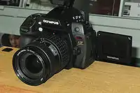 Con la llegada de la fotografía digital, Olympus volvió a subirse al carro de las grandes cámaras pensadas para grandes fotógrafos. En 2001 lanzó la E-10, una digital de 4 megapixeles y anticipo de lo que vendría dos años más tarde, en 2003 con el sistema Cuatro Tercios.