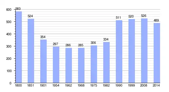 Los datos demográficos contemplados en este gráfico de la comuna de Omonville-la-Rogue[4] se han cogido de 1800 a 1999 de la página francesa EHESS/Cassini, y los demás datos de la página del INSEE.[5]