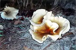 Los cuerpos fructificantes (basidiocarpos) pueden ser vistos en la madera muerta o enferma.[2] Pueden ser vistos durante la noche por su resplandor blanquecino pálido en la base de eucaliptos.[3] El sombrero tiene un color muy variable, algunas veces es color crema aunque también puede ser teñido de naranja, marrón, gris, morado o, incluso, en tonos azul-negro. El borde tiene un tono más ligero, en general, cremoso, si bien las presentaciones marrones tienen tonalidades canela o marrón. Generalmente el centro tiene tonos más oscuros,[4] que suelen ser más intensos en especímenes más jóvenes. Al crecer hasta 30 cm de diámetro, el sombrero adopta una forma de abanico o embudo con bordes enrollados. Las láminas, de color blanco cremoso, son decurrentes[n. 1] y frecuentemente gotean con la humedad;[6] pueden tener hasta 13 mm de profundidad y estar un poco distantes o con espacios estrechos entre sí; también pueden desarrollar un borde liso que se erosiona en la madurez.[7] El estipe puede ser central a lateral en el encaje con el sombrero, llega a medir hasta 8 cm de largo y estrecharse en la base. La carne fina es blanca cremosa,[6] pero puede tener tonos rojizos cerca de la base del estipe. No tiene olor o sabor distintivo. La esporada es blanca.[7]