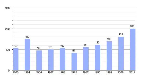 Los datos demográficos contemplados en este gráfico de la comuna de Oncourt[4] se han cogido de 1800 a 1999 de la página francesa EHESS/Cassini, y los demás datos de la página del INSEE.[5]