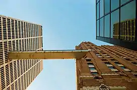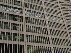 La fachada de la estructura consiste en pilares revestidos de mármol blanco que se unen a la base y dividen cada lado en cuatro compartimentos. Las ventanas de los pisos superiores tienen solo 12 pulgadas de ancho y se colocan en paneles prefabricados de concreto y chips de mármol que cubren dos pisos. Aunque las ventanas se extienden casi desde el suelo hasta el techo, su estrechez evita la sensación de acrofobia, una condición a la que se dice que Yamasaki estuvo sujeta.[8] La parte superior e inferior de las aberturas de las ventanas se encuentran en un arco estilizado, lo que resulta en una delicada apariencia de celosía que Yamasaki reutilizó en sus diseños para el IBM Building en Seattle, el Conservatorio de Música Oberlin y las torres del World Trade Center. El enrejado es ininterrumpido desde el segundo hasta el piso 28, aunque en los pisos mecánicos por encima de 26, los espacios en el enrejado permanecen abiertos en lugar de ser acristalados. Estos pisos están encerrados por una pared empotrada y el espacio entre las paredes exteriores e interiores se ilumina después del anochecer. Desde la apertura del edificio hasta principios de la década de 1980, el piso 26 estaba ocupado por un restaurante exclusivo conocido como The Top of the Flame.[9]