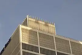 La estructura principal se asienta sobre una plataforma elevada que oculta el muelle de carga y las entradas de servicio. Tiene 26 pisos útiles, una planta técnica de doble altura y un piso subterráneo. El vestíbulo se eleva dos pisos desde la base y está rodeado por paneles de vidrio enmarcados en cromo. Los paneles decorativos tienen el mismo diseño hexagonal que los marcos de las ventanas en los pisos superiores. Las paredes del vestíbulo están empotradas desde la fachada del edificio para crear una logia en los cuatro lados del edificio. El piso de la logia está cubierto con mármol blanco cortado en un diseño hexagonal y fluye ininterrumpidamente hacia el piso del vestíbulo interior y hasta las paredes de los bancos del ascensor. El techo del nivel principal consiste en paneles cuadrados artesonados que tienen una lámpara empotrada. Debajo de cada bombilla, un soporte de cuatro brazos sostiene una esfera de vidrio azul o verde que difunde la luz y proyecta el color sobre el piso blanco.