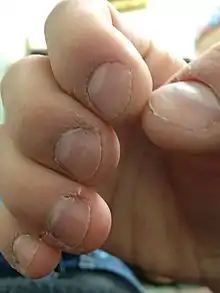 - Jabr FI (septiembre de 2005). «Severe nail deformity. Nail biting may cause multiple adverse conditions». Postgrad Med 118 (3): 37-8, 42. PMID 16201307. doi:10.3810/pgm.2005.09.1712.