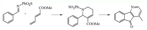 Clary y colaboradores sintetizaron la oniquina a través de una reacción de aza-Morita-Baylis-Hillman utilizando N-(bencilideno)bencensulfonamida con 2,4-pentadienoato de metilo, seguido por una adición conjugada intramolecular, una acilación de Friedel-Crafts , una adición de metilo por acción del metilcuprato y formación del anillo aromático.[6]