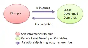 - la Clase se define como un conjunto de instancias que comparten propiedades comunes. Por ejemplo, como se muestra en la Figure 1, Etiopía, un objeto del mundo real, se define como instancia. Propiedades comunes de instancias (Etiopía, República de Corea, Italia, etc) se extraen de la definición de una clase llamada “autónomos”. Así, en la figura 1, el círculo rosa de la izquierda ilustra la clase “autónomo” y “Etiopía” es un individuo contenido en la clase “autónomo”. El círculo verde de la derecha representa la clase “grupo”; y “países menos adelantados” es un individuo incluido en la clase “grupo”.