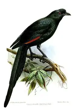 Es un estornino de gran tamaño, mide 40 cm de longitud en promedio y pesa 160 gramos.[5] El plumaje es principalmente negro oscuro iridiscente con las primarias de color marrón rojizo y la cola fuertemente graduada con las plumas centrales largas y un brillo verdoso. La hembra tiene tonos de color verde en la cabeza y la garganta y gris alrededor de los ojos y en las coberteras auriculares. Ambos sexos tienen una cresta de plumas erizadas en la base del pico y en la frente. El iris es de color carmesí profundo y las patas y el pico son negras.