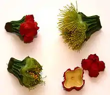 Los botones florales del Eucalyptus erythrocorys poseen un opérculo grande, brillante y rojo.