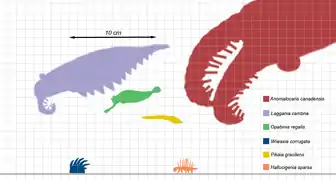 - Comparación a escala de Opabinia junto a otras especies del Cámbrico