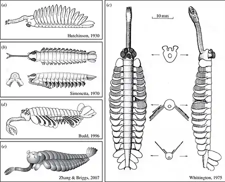 En 1996, estudios previos realizados por Graham Budd del anomalocárido Kerygmachela[17] sugirieron que Opabinia poseía apéndices sin articulaciones basándose en la similitud de sus apéndices con la de otros ejemplares del esquisto de Burgess emparentados con los artrópodos. Después de examinar varios conjuntos de características compartidas por estos y otros lobopodios similares, Budd elaboró una "reconstrucción a gran escala del grupo madre de los artrópodos".[6]