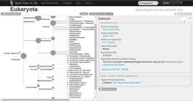 El Open Tree of Life es un árbol filogenético de la vida en línea, un esfuerzo colaborativo, financiado por la National Science Foundation.[2][3] El primer borrador, que incluye 2,3 millones de especies, se publicó en septiembre de 2015.[4] El gráfico interactivo permite al usuario acercarse a clasificaciones taxonómicas, árboles filogenéticos e información sobre un nodo. Al hacer clic en una especie, se devolverá su taxonomía de origen y referencia.
