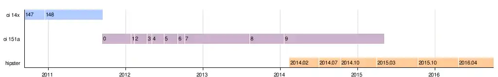 La primera versión de desarrollo de OpenIndiana, Build 147, fue liberada el 14 de septiembre de 2010,[19] mientras que una segunda versión en desarrollo, Build 148 se liberó el 17 de diciembre de 2010.[20] Una tercera versión, Build 151, fue liberada el 14 de septiembre de 2011 que es la primera en basarse en Illumos. La versión Build 151a7 adecuada para las arquitecturas Intel y AMD fue presentada el 6 de octubre de 2012. Otra revisión denominada OpenSXCE 2013.01 SPARC Build 151a fue presentada a través del sitio web de OpenIndiana el 1 de febrero de 2013.[21] En el año 2016, fue liberada la versión OpenIndiana 2016.10 “Hipster”, como novedad tiene actualizados sus componentes y nuevas funciones, y se ha incluido una nueva versión del entorno de escritorio MATE 1.14[22]