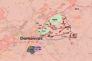 Ghouta estaba oficialmente reducido a tres bolsillos, uno en el del norte alrededor de Douma aguantado por Jaysh al-Islam; un segundo en el del sur alrededor de Hamouria aguantado por Faylaq al-rahman; y un tercer en el del oeste alrededor de Harasta aguantado por Ahrar al-Sham.[110]