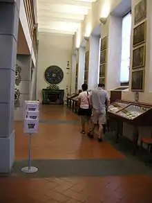 La sala principal tiene planta rectangular y doble altura. Mediante la inserción de tres pilares masivos de orden gigante (en hormigón y cubiertos en pietra serena con vetas horizontales) que definen cuatro espacios de planta cuadrada: estos "nichos" en la planta baja dan al corredor con ventanas, mientras que en el piso superior desaparecen para dar paso a un solo compartimento marcado solo por el signo vertical de los pilares. Las vitrinas, en madera de cerezo y peral, albergan las piezas de acuerdo con una disposición temática y cronológica y se alinean en las paredes de los cuatro nichos y en el lado de la ventana, más abajo. En la parte inferior de la sala se encuentra la escalera recta que conduce al piso balcón: que da acceso a las habitaciones del siglo XIX, y se caracteriza por el mismo revestimiento de piedra y diseño de los pilares; son de piedra también los rodapiés y la balaustrada, inspirada en Buontalenti, mientras que los ascensores están cubiertos con losas de piedras duras (rojo, amarillo y verde). La sala y las habitaciones laterales están iluminadas por una luz difusa, mientras que todas las ventanas están iluminadas en su interior a través de fibra óptica.