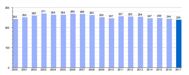 Gráfica de evolución demográfica de Orón entre 2000 y 2017 |