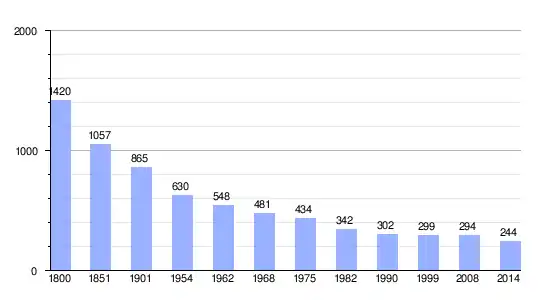 Los datos demográficos contemplados en este gráfico de la comuna de Oradour[4] se han cogido de 1800 a 1999 de la página francesa EHESS/Cassini, y los demás datos de la página del INSEE.[5]