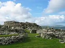 Skara Brae se compone de diez casas agrupadas y es el poblado neolítico más completo del norte de Europa. Las viviendas están construidas con gruesos muros en piedra seca.[29] Ocupado entre 3100-2500 a. C., las casas son similares a las de Barnhouse, pero están unidas por pasajes comunes y fueron construidas en un gran muladar que contiene cenizas, huesos, conchas, piedras y residuos orgánicos. Solo los techos, que estuvieron apoyados, probablemente, sobre maderas o huesos de ballena, habrían sido visibles desde el exterior. En cada caso los aparadores de piedra fueron construidos de manera que dominaban la vista al entrar en la casa, que era por una puerta baja, también hay tallas elaboradas de significado desconocido en algunas de las piedras de las casas y pasajes. Una gran variedad de cuentas de hueso, alfileres y colgantes y cuatro bolas de piedra tallada también fueron descubiertas en el sitio, que fue revelado solo después de una tormenta en el invierno de 1850 que arrancó la hierba de la duna de arena que la cubría. Las ruinas existentes en su mayoría pertenecen a una fase secundaria de la construcción con las bases de la primera fase en gran parte oculta de la vista.[30][31]
