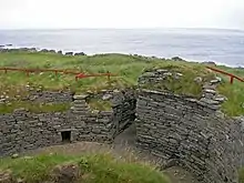 Los wheelhouses (en español timonera) son edificios de piedra de la Edad del Hierro tardía cuyas características incluyen una pared exterior en el que un círculo de pilares de piedra (que tiene una semejanza con los radios de una rueda) forman la base para el dintel de arcos que soportan el tejado voladizo con un fogón en el centro.[89] Ocho presuntos yacimientos han sido identificados en las islas Orcadas, aunque el estilo es diferente del de las Shetland y las Hébridas Exteriores. Los lugares de las islas Orcadas son: cuatro en Sanday, uno en Calf of Eday, uno en Hillock de Burroughston en Shapinsay y dos en Mainland en broch Burrian y Broch de Gurness.[90][nb 6]