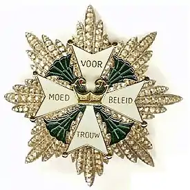 La Orden militar de Guillermo (en neerlandés: Militaire Willems-Orde), abreviado MWO, es el honor más antiguo y más alto del Reino de los Países Bajos. La Orden lleva el nombre de san Guillermo de Gellone (755–814), el primer príncipe de Orange. [2][3] El lema de la Orden es Voor Moed, Beleid en Trouw (‘Por valentía, liderazgo y lealtad’). La orden caballeresca fue establecida el 30 de abril de 1815 por el rey Guillermo I y fue presentada por hazañas de excelente valentía en el campo de batalla y como una decoración meritoria para oficiales militares de alto rango. Comparable con la Legión de Honor francesa, aunque concedida con menor frecuencia, la Orden Militar de Guillermo es una orden de mérito de caballería abierta a todos, independientemente de su rango y nobleza, y no solo al ejército neerlandés sino también a los extranjeros. Hasta la fecha, la membresía de la Orden rara vez se otorga y solo por su excelente valentía en la batalla.