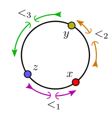 Dado un orden lineal < sobre un conjunto X, el orden cíclico sobre X inducido por < se define como sigue:[6]