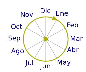 En matemáticas, un orden cíclico es una forma de organizar un conjunto de objetos dispuestos sobre una circunferencia.[1] A diferencia de la mayoría de las estructuras en teoría del orden, un orden cíclico no se modela como una relación binaria habitual del tipo "a < b". Por ejemplo, no se dice que el norte esté situado "más en el sentido de las agujas del reloj" que el sur. En cambio, un orden cíclico se define como una relación ternaria [a, b, c], lo que significa que "después de a, se llega a b antes de pasar por c". Por ejemplo, de acuerdo con la imagen de la derecha, la terna de meses del año [junio, octubre, febrero] responde a esta definición, pero en cambio la terna formada por [junio, febrero, octubre] no lo hace. Una relación ternaria se denomina orden cíclico si es cíclica, asimétrica, transitiva y conectada. Descartar el requisito de "conectada" da como resultado un orden cíclico parcial.[2]
