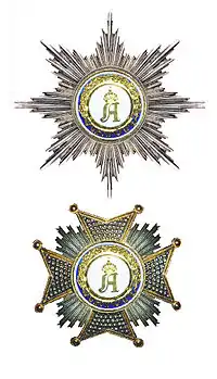 - La venera de la división civil de la Orden es -para la Gran Cruz- una estrella de plata facetada con ocho puntas o rayos y centrada con el medallón de la orden, o -para Gran Oficial- una Cruz de Malta de aspas facetadas de plata y con los rayos, de lo mismo, entre los brazos. El medallón central es el mismo que en la insignia. La placa de la división militar muestra dos espadas cruzadas adicionales bajo el medallón central, con empuñaduras de oro y hojas de plata, y la correspondiente insignia muestra dos espadas cruzadas en oro.[2]