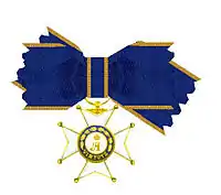 - La cinta de la orden es de muaré azul con una pequeña franja anaranjada en cada borde.[2]