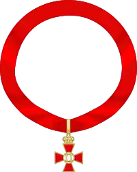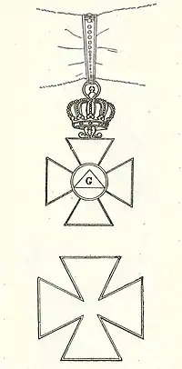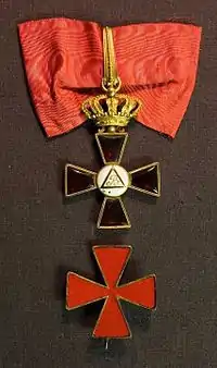 La insignia consta de una cruz de San Jorge roja, en cuyo centro porta una medalla circular blanca con el monograma del institutor, dos letras C opuestas, circundantes a la cifra XIII, en oro. En el anverso tiene la letra B en oro dentro de un triángulo equilátero negro con bordes dorados. La cruz es superada por una corona dorada cerrada. La insignia es lucida alrededor del cuello, pendiente de una cinta roja.