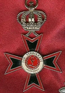 La insignia de la orden es una cruz octógona de oro rojizo (es decir una aleación de oro, plata y cobre, aunque las últimas cruces realizadas en 1918 eran de plata sobredorada),[2] esmaltada como si contuviera dos cruces concéntricas una menor que la otra, la más grande, de color rojo, llega hasta el borde dorado de la cruz; y la más pequeña, cercana al centro es de color negro. En el centro de la Cruz, hay en su anverso un medallón pequeño esmaltado de rojo que contiene la inicial gótica "L" del fundador en dorado, rodeada de una corona de laureles de lo mismo. Alrededor del medallón, un anillo ancho esmaltado de blanco con la divisa: "FÜR VERDIENST" (al mérito) en dorado y superando el medallón central; en la parte inferior del anillo un adorno de fitaria dorado. En el reverso el medallón central, de fondo negro, contiene una inscripción dorada en cuatro líneas: "GOTT EHRE VATER LAND" (Dios, honor, patria); alrededor del mismo un anillo ancho con una corona láurea esmaltada de verde. Sobre la cruz una corona real.